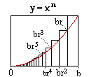 (0 to b) x^n dx is computed by taking the areas of an infinite number of unequall subintervals; larger subintervals at x close to b, smaller when close to 0.